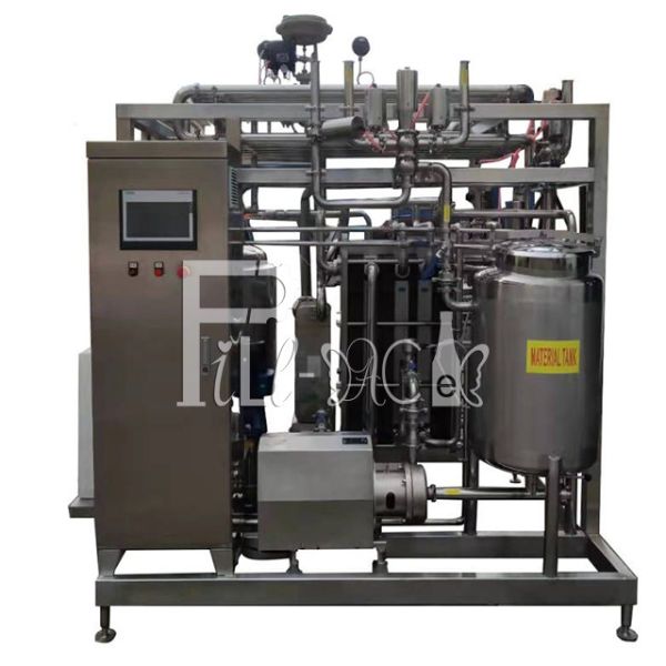 1.This is an once integrated sterilizing equipment which is used to heat,sterilize,warm and cool heat-sensitive liquid such as fresh milk,juice beverage and wine. It can make the materials to prolong the quality guarantee time through sterilization and cooling. 2. Adopt the treating methods of the ultra high temperature: It can make the liquid milk, tea drink and juice to reach a strict sterilization, then transfer it to aseptic package. The sterilizing temperature is 80-137℃ and the warming time is 5-30s.The machine could keep the original color and flavor of the beverage and dairy product as much as possible. The guarantee time can reach 6 to 12 months. 3.The equipment has the features of high recovery rate, compact structure, beautiful appearance and easy safe temperature control. The liquid through the sterilization of the machine can be used to hot filling and cold filling. The temperature of the outlet materials can be controlled automatically. The equipment has two modes of PLC control type and semi-automatic type. It also has safety protection measurement, alarm for high temperature and function of low temperature reflow. It can make various assembly designs. 4. Main configuration of equipment: material pump, balancing tank, hot water system, temperature controller and recording meter, electrical control system.